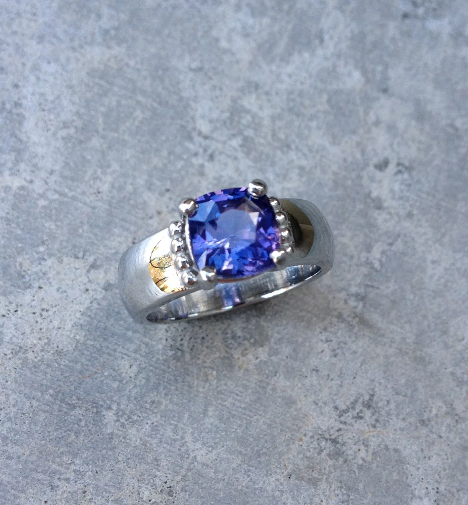 Judy contacted me before I left for the Tucson Gemshow this year and asked me to look for a tanzanite for a new ring design. Tanzanites are a beautiful blue purple but are not that durable for a daily wear ring. Judy wanted to be able to wear her new ring all the time so I suggested a sapphire. Sapphires come in a rainbow of colors and with some searching I was able to find this color change sapphire. It was a bit nerve wracking for both us us- I was shopping and calling Judy with what I found and she was trying to decide on how to spend her budget by only looking at iPhone photos I was sending! The decision was made on this stone because of the shape and the strong hint of purple. It is more blue in natural light and appears more purple under synthetic lighting. It's almost like having two stones in one!